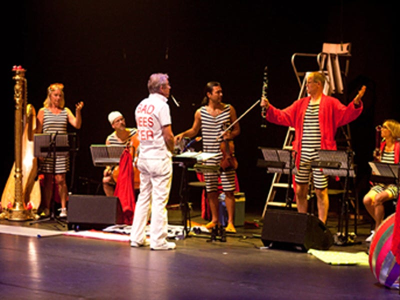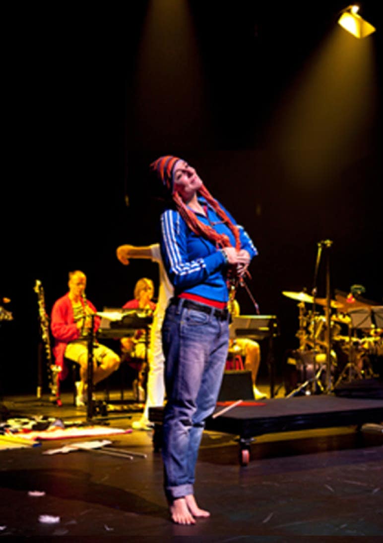 Instrumentation for 1 singer/actress, cl, bs, trb, hp, vi, vc and perc